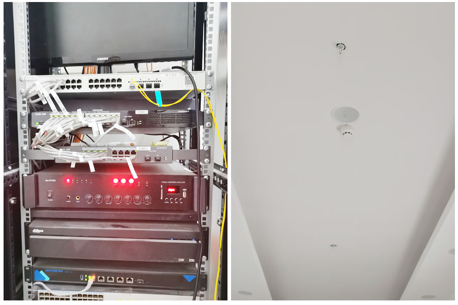 高等职业院校校园IP网络广播系统教学楼、实训楼、办公楼广播部分,设计采用“网络转定压”接收,维护日常教学和生活秩序。在每层部署1-2台IP网络功率放大器,在走廊间隔8米均匀布置壁挂/吸顶天花喇叭,通过RVV2*1.0双芯护套线连接到IP网络功率放大器。支持接收广播中心和分控中心定时广播、手动广播和寻呼广播。