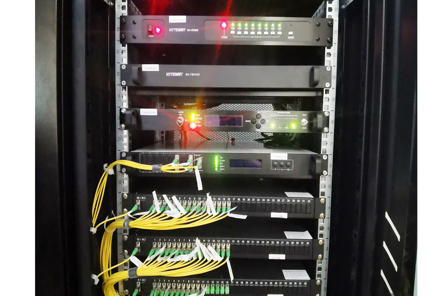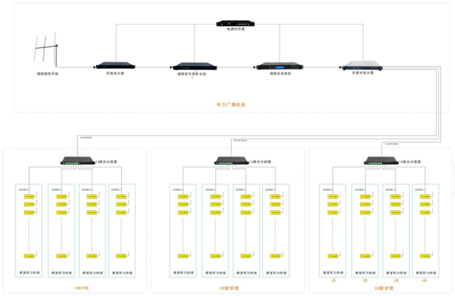 英语考试听力同频无线转发系统主要由机房部分、传输部分和终端部分三部分组成。机房部分作为听力系统的核心,负责接收考试院下发的听力频率信号,进行信号调整和光转换、放大和分路下行传输。传输部分则利用HFC光网络将听力光信号传输至各个考场(教室)。终端部分在每个考场安装海特伟业教室听力终端,接收听力光信号并进行微功率放大,通过天线在考场内均匀覆盖。