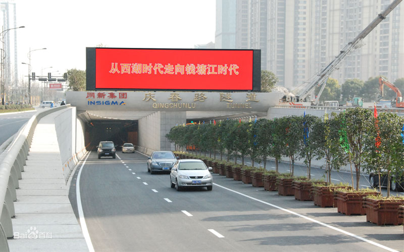 杭州庆春路过江隧道位于杭州市东南部钱塘江江底,钱江二桥与钱江三桥之间,隧道北接杭州庆春东路,南连萧山市心北路,沟通钱江新城与钱江世纪城,全长4180米,江底盾构段长度1766米,车道净高4.5米,为双向双管四车道布置,设计时速60公里/小时。