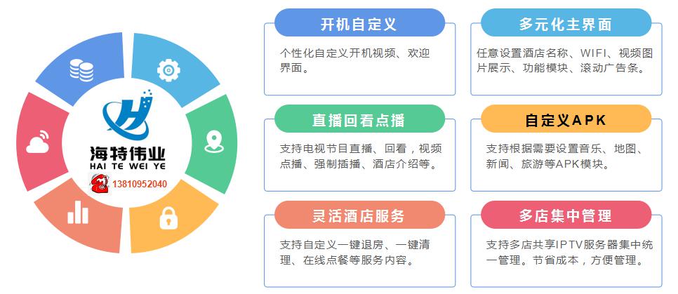 海特伟业酒店宾馆IPTV智慧电视系统,综合国内外酒店宾馆对电视系统的最新需求,提出了基于HLS技术的酒店宾馆IPTV电视网络一体化解决方案,具备功能完备、简单易用、长久稳定、体验完美的特点。该方案可实现开机视频、画面定制,多元化节目源接入,高清电视节目的直播、回放、点播、插播,宣传视频、图片定制,多达11个APK板块部署,退房、清理、点餐服务互动,多店共享服务器集中统一管理等功能,完全满足不断发展的现代化酒店宾馆对电视系统的不同要求,是建设酒店宾馆IPTV电视系统的优选解决方案。