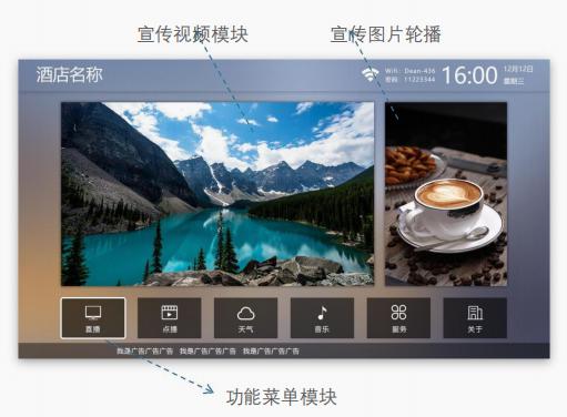 界面标题栏显示酒店宾馆名称、机顶盒wifi信息、时间日期。