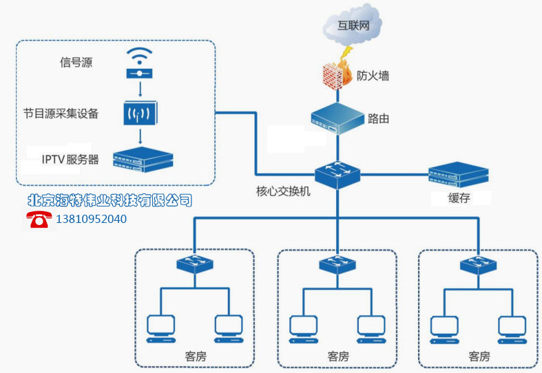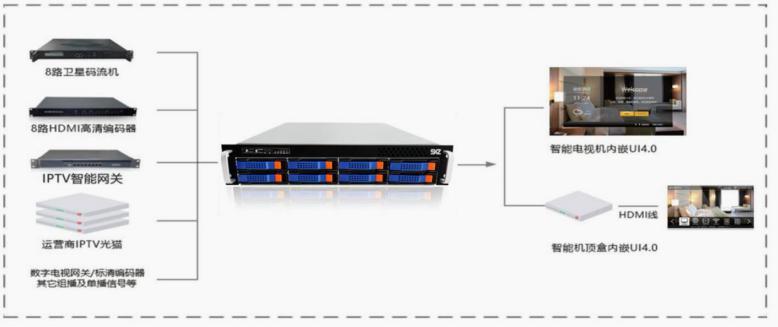 支持IPTV服务器采集运营商IPTV源、卫星源、广电源、网络源等,采集后接入到酒店宾馆核心交换机,并通过IP网络传输到各个房间。接收终端智能电视机+APK、普通电视机+安卓机顶盒。