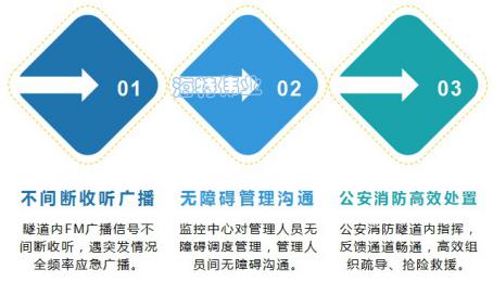 隧道无线通信与调频广播覆盖系统,能够保障在突发事件的处理过程中,隧道区段的驾驶员能够通过车载收音机及时、准确地获取相关信息,并在应急广播的指挥下有序撤离或等待救援;能够满足隧道管理人员、公安消防部门高效沟通、指挥、调度的需要;是建设隧道应急管理处置手段不可或缺的选择。