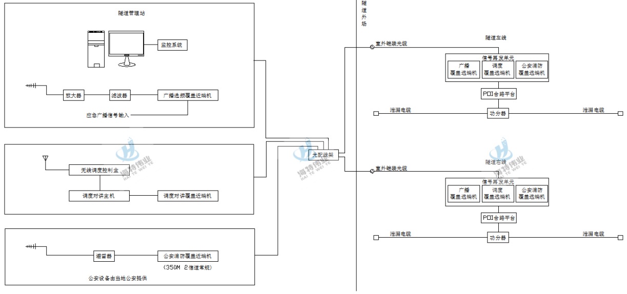 隧道公安消防无线集群覆盖系统可以提供公安和消防对讲机与其相应的中心台通信的中继转接功能,使交警和消防人员在管廊区域内与外界的手持台通讯畅通无阻。实现消防和公安无线通信系统的引入和覆盖。
