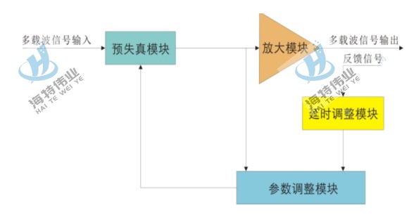 数字预失真技术就是通过对输入信号进行预先的数字失真处理,其失真特性与后级非线性功放的失真特性刚好相反,这样当数字预失真处理后的失真信号经过后级非线性功放后,后级非线性功放的失真特性刚好抵消了数字预失真的处理,并采用非线性记忆模块处理记忆效应带来的问题,最终宽带功率放大器输出的信号实现多载波信号的线性放大和记忆效应消除。