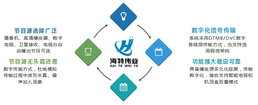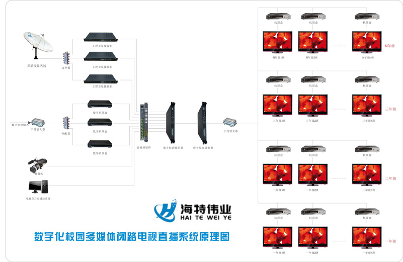 3)外部有线电视节目可根据需要转播到各个教室。可选用当地有线电视或卫星接入方式。