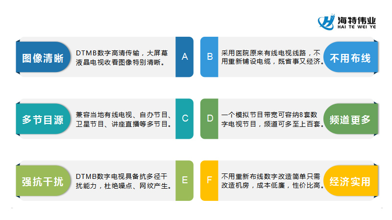 6、经济实用高性价比:由于不需要更换系统传输线路,仅对前端进行改造即可,大大节省了系统改造成本,减少了系统改造时间。本系统在保证先进、科学“五年不落伍”的同时,充分考虑到了各种医院现有的有线电视传输环境,为改造升级提供了非常经济的解决方法。