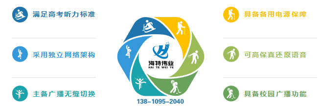 海特伟业标准化考点考场高考英语听力广播系统,坚持“技术先进、标准一流、经济实用、利于拓展、方便维护”的设计理念,紧密结合学校双备份英语听力考试广播系统建设任务实际,开拓思路、创新设计,力争为贵校打造集“校园广播、背景音乐、紧急广播、听力训练、听力考试”等多种功能于一体的“考常一体、备份保障”的综合性新型高考英语听力广播系统。具体功能如下: