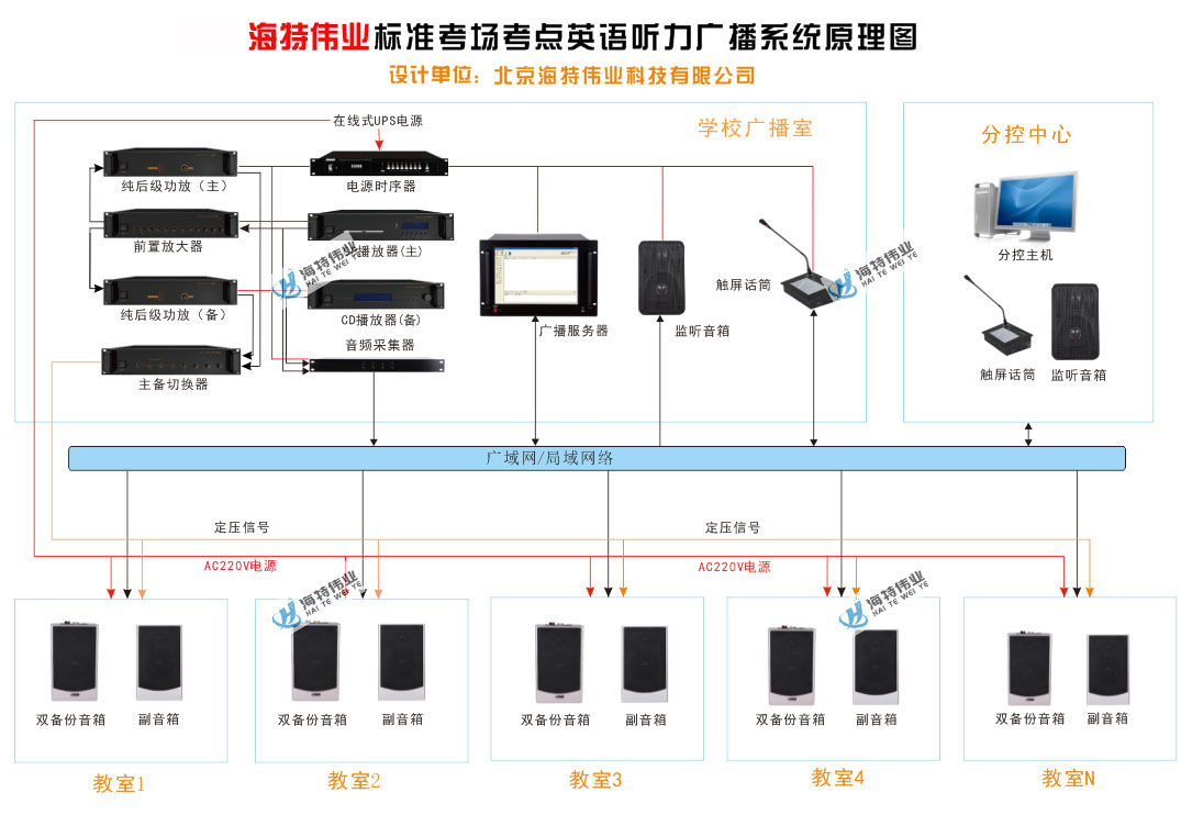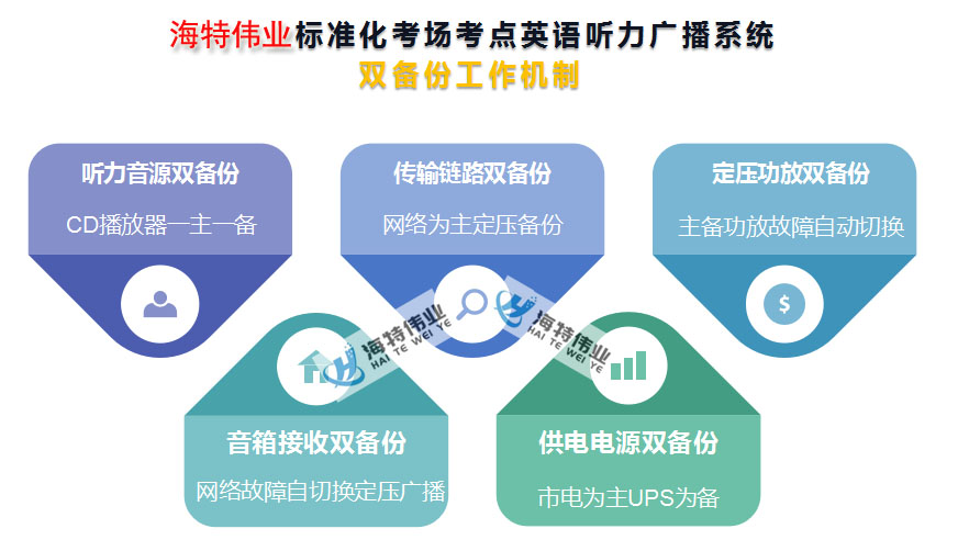 海特伟业(品牌:HYTEWAY)标准化考点考场高考英语听力广播系统,将数字网络广播和模拟定压广播架构和各自优势融为一体,采用多维度双备份工作机制全新设计思路,最大限度保障高考英语听力考试广播系统零故障高稳定性运行,具体如下: