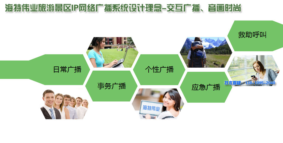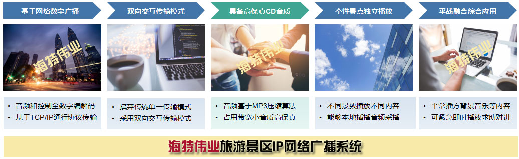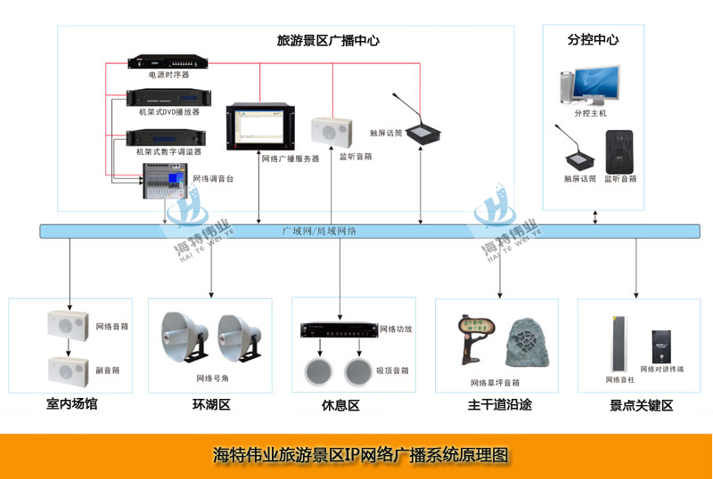 海特伟业旅游景区IP网络广播系统,是综合应用当今世界广泛使用的TCP/IP网络技术的基础上, 采用“平战融合、创新应用”的一体化先进理念设计的,集“日常广播、事务广播、个性广播、应急广播、求助呼叫”等多种功能于一体,构建的基于IP网络的新一代交互双向、音画时尚旅游景区广播系统。该系统是一套纯数字传输的双向音频扩声系统,彻底解决了传统广播系统存在的音质不佳,维护管理复杂,缺乏互动性等问题,真正实现了计算机网络、数字视频监控、公共广播的多网合一。是适应时代发展趋势的,最具前瞻性、应用性、科学性的新一代广播系统。