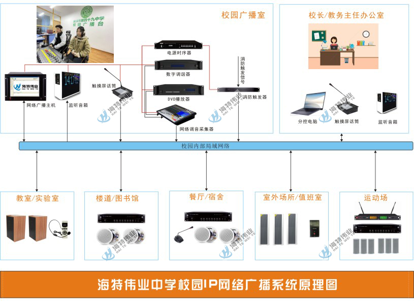 每个教室安装主副海特伟业网络音箱各一只,具备CD级音质可高保真语音还原,每个音箱具有独立IP地址,能够接受广播中心和分控中心的广播指令,按设定权限自动选择播放。可扩展定压备份广播,支持110V模拟定压广播信号输入,具备主备故障检测自动切换功能。教室网络音箱可外接多媒体设备(电脑、教学一体机)音源,进行教学音频扩声。老师上课时可佩戴无线话筒,通过蓝牙话筒讲课扩声。