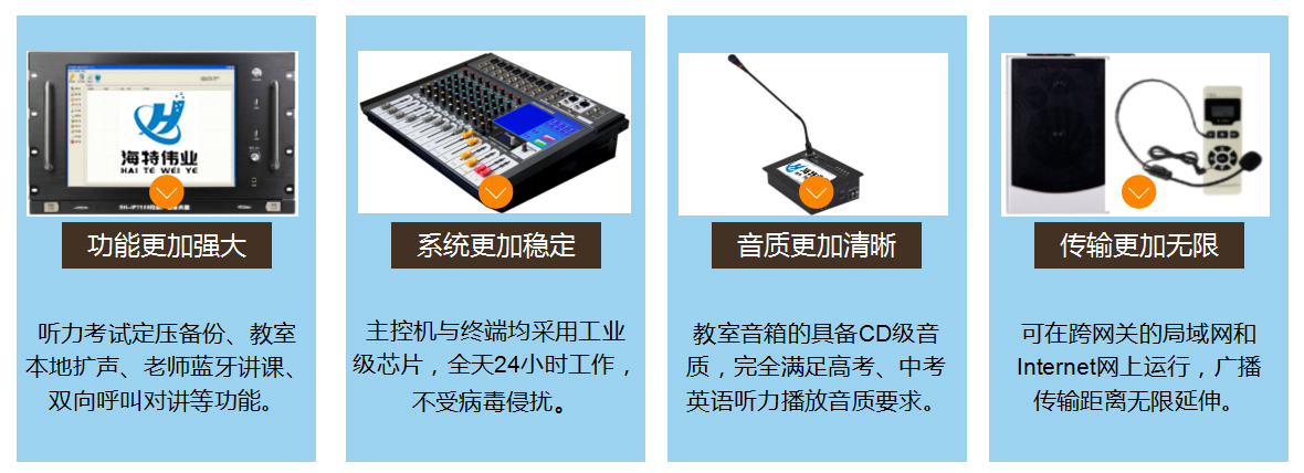 由于海特伟业采用了网络传输技术,使音频信号无传输干扰及失真。采用了MP3压缩算法占用网络带宽低(8k-128k)又能保证音质具高保真度,教室音箱输出音质接近CD级,满足对声音质量要求较高的场合,如高考、中考考试听力播放,及教室里的日常外语听力训练,每个发音都可以清晰可辨,不再为含混不清的声音所困扰。