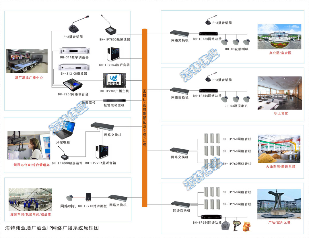 3)在勾兑中心、包装车间采用“BH-IP7650网络功放+BH-30B天花喇叭”播音,勾兑中心和包装车间,设置分控中心。