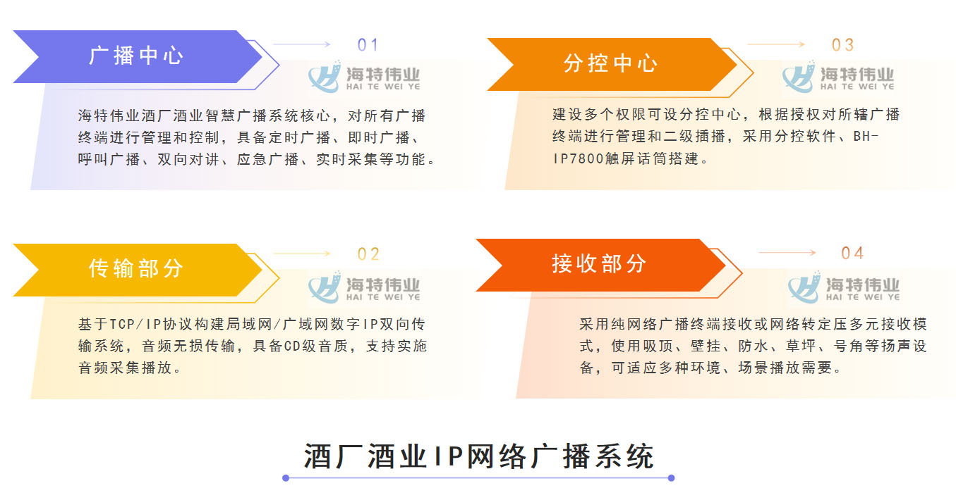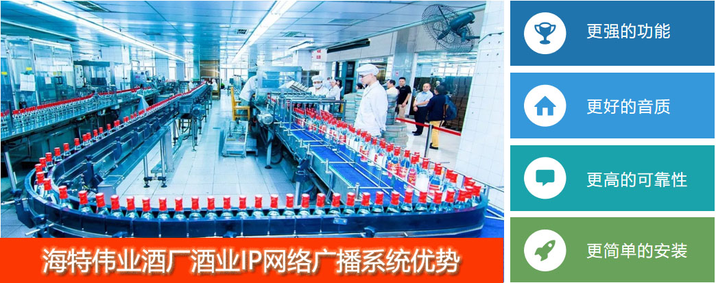 海特伟业酒厂酒业IP网络广播系统是完全不同于传统广播系统、调频寻址广播系统和数控广播系统的产品,多方面体现了显著的优越性: